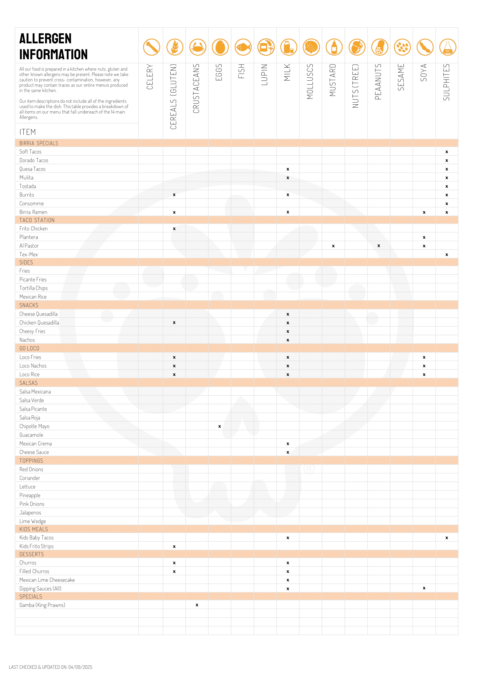 Our dish descriptions do not include all of the ingredients used to make the dish. Below is a breakdown of all items on our menu that fall under each of the 14 Allergens.